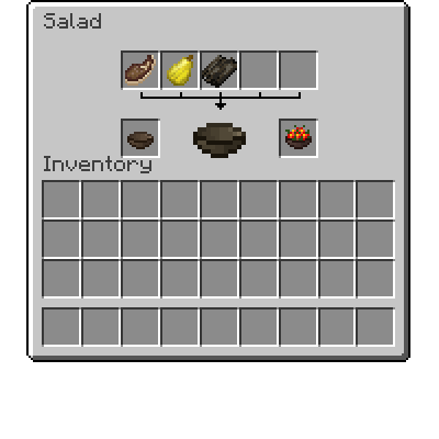 샐러드 화면은 key.sneak 키를 누른 상태로 key.use하면 열 수 있습니다. 음식을 추가하고 준비가 끝나면, 오른쪽의 슬롯에서 샐러드를 꺼내세요.